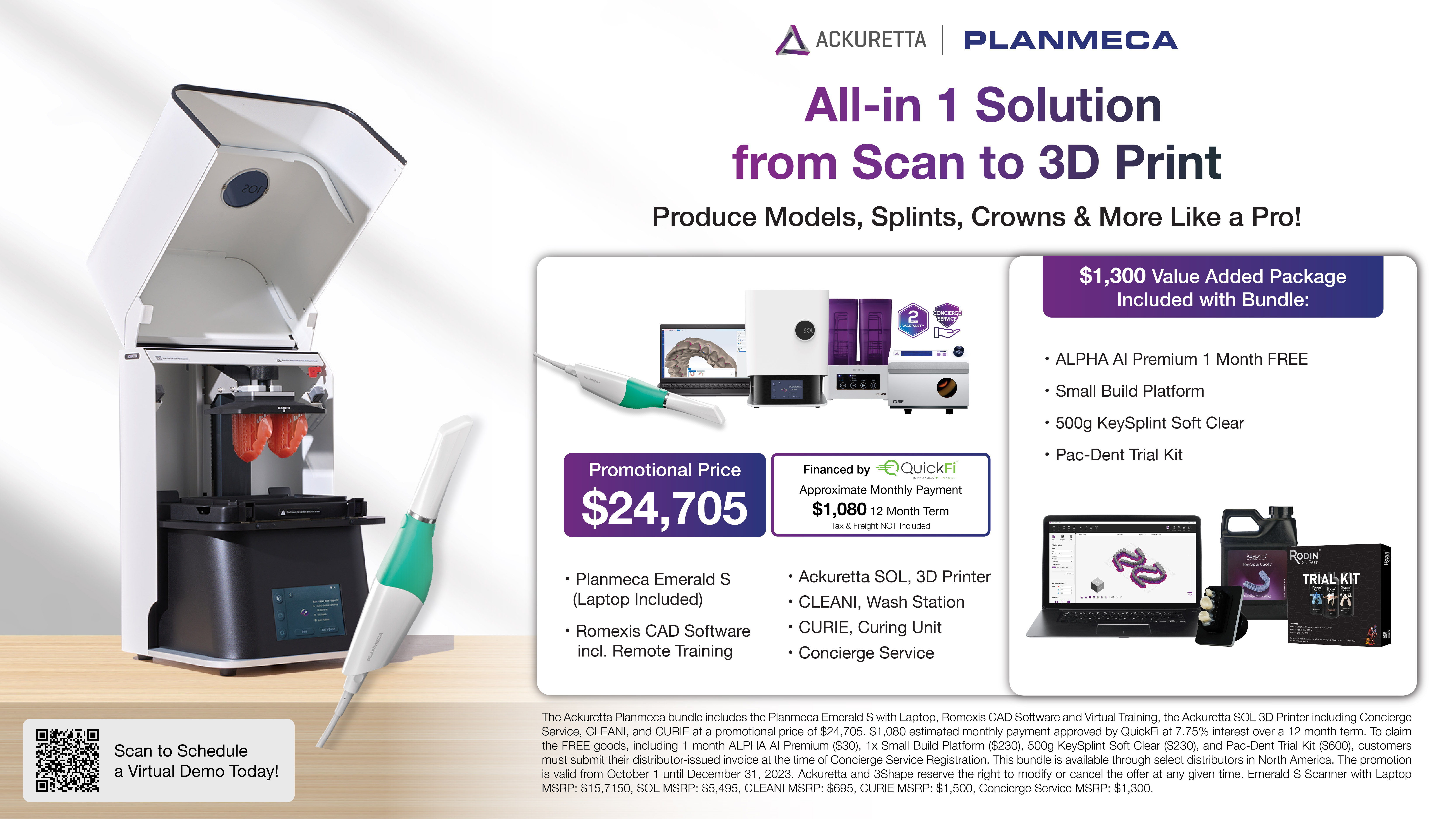 The promotional price of $24,705 includes the Planmeca Emerald® S scanner, laptop, Planmeca Romexis® CAD software with remote training, 3D printer, SOL, the dual wash station, CLEANI, the biocompatible UV curing oven, CURIE, and the Ackuretta Concierge Service, which provides remote installation, training, and support with an extended 2-year warranty for SOL.